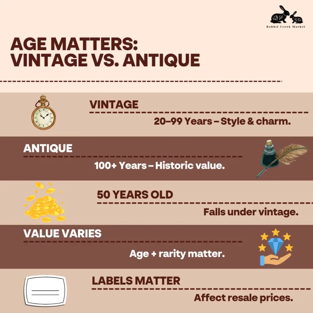 - Vintage: Items between 20 and 99 years old, reflecting styles from past decades.
